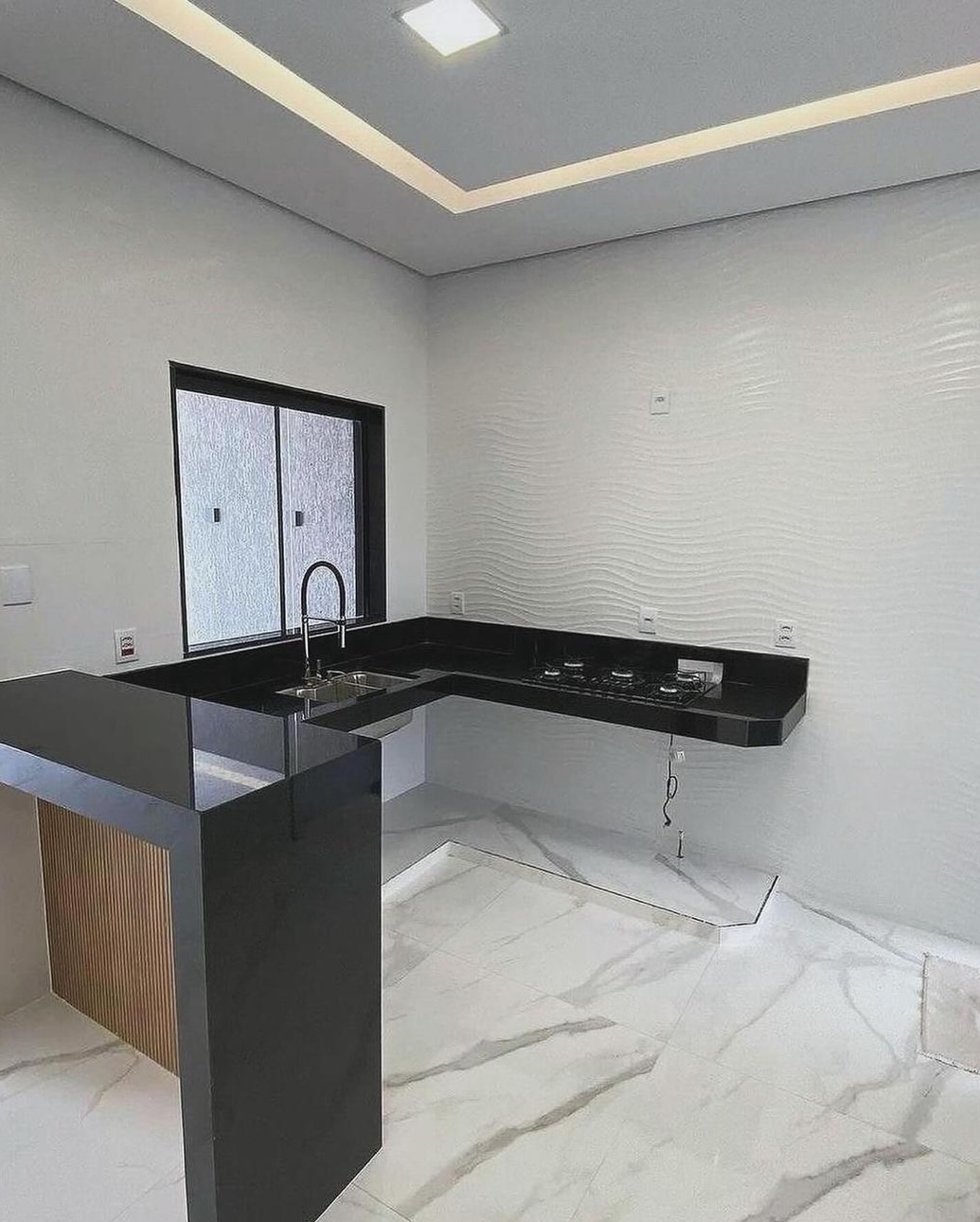 ✅ forro dilatado com uma ilha na cozinha com pendentes;
